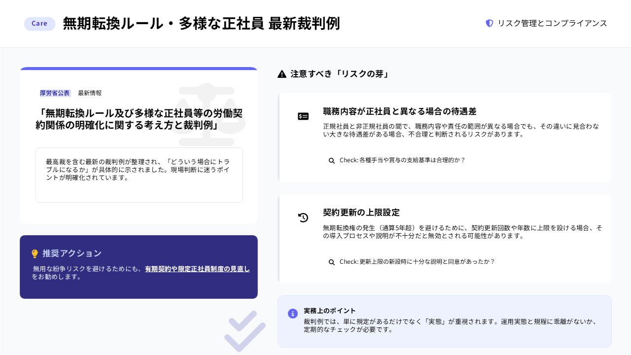 厚生労働省公表の最新裁判例から、「待遇差」「更新上限」等のリスク管理ポイントをご紹介。規程と運用実態のギャップをなくすためのチェック項目も掲載しています。